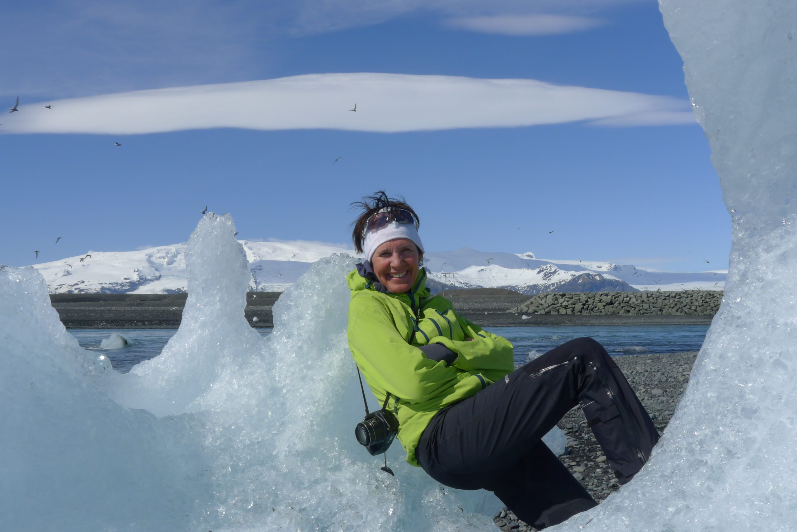 Siste stopp er Jökulsarlon. Et besøk vi fikk ved at fjellturen ble utsatt en dag. Men ingen ting er vakrere og morsommere enn å tilbringe en dag mellom isskulpturer, sel, måse og rødnebbtjernen. Her får vi den første kontakten med Vatnajókull. Her velter breen seg utover. Den sprenger seg vei gjennom elven før den treffer standen og det blir det flotte skulpturer av.(teksten fortsetter under bildet)