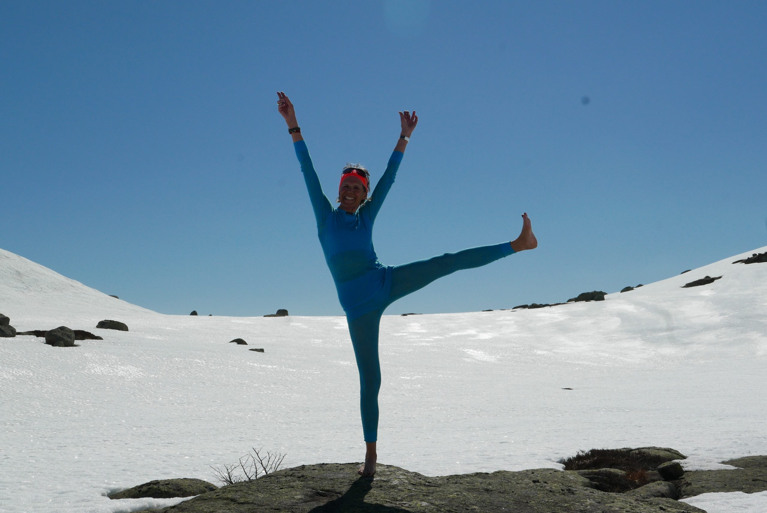 Så feil kan man ta. Jeg meldte meg på yoga fordi det skulle være bra for leddene og vips så satt jeg der på matta med stive bein og skulle bøye meg fremover for å rekke tåa. Ryggen lot seg ikke bøye, og det var nitti graders vinkel og tåa utenfor rekkevidde. Rundt meg satt det gummikropper som lett la panna i gulvet mellom lårene. Det er i slike øyeblikk det ikke er mulig å «være i seg selv». Jeg gløtta mye rundt og var takknemlig for å sitte på bakerste rad. Neste øvelse var å stå på en fot. Det høres lett ut, men det synes ikke anklene. Det var noe galt med balansen.